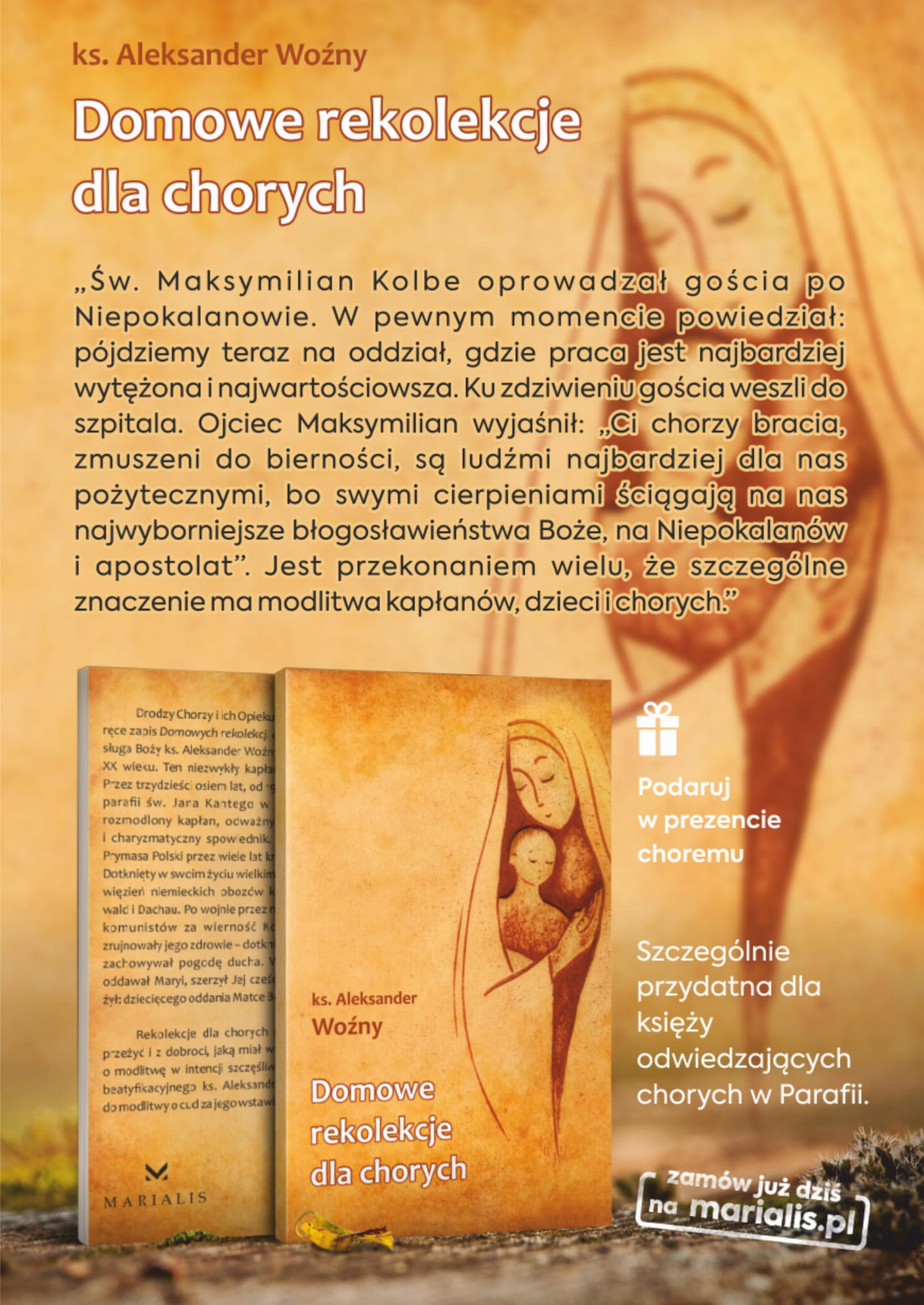 Niesamowite Domowe rekolekcje dla chorych, które wygłosił sługa Boży ks. Aleksander Woźny. Ten niezwykły kapłan żył w latach 1910–1983. Świątobliwy, rozmodlony kapłan, odważny duszpasterz, heroiczny i charyzmatyczny spowiednik. Z nominacji bł. Stefana, Prymasa Polski przez wiele lat krajowy duszpasterz kobiet. Dotknięty w swoim życiu wielkim cierpieniem: przez pięć lat więzień niemieckich obozów koncentracyjnych Buchenwald i Dachau. Po wojnie przez niemal rok uwięziony przez komunistów za wierność Kościołowi. Te przeżycia zrujnowały jego zdrowie – dotknięty rozmaitymi chorobami zachowywał pogodę ducha. Wszystko w swoim życiu oddawał Maryi, szerzył Jej cześć, nauczał tego, czym sam żył: dziecięcego oddania Matce Bożej. Rekolekcje dla chorych płyną z jego własnych przeżyć i z dobroci, jaką miał wobec cierpiących. Są niczym perła, która czeka na odkrycie.
