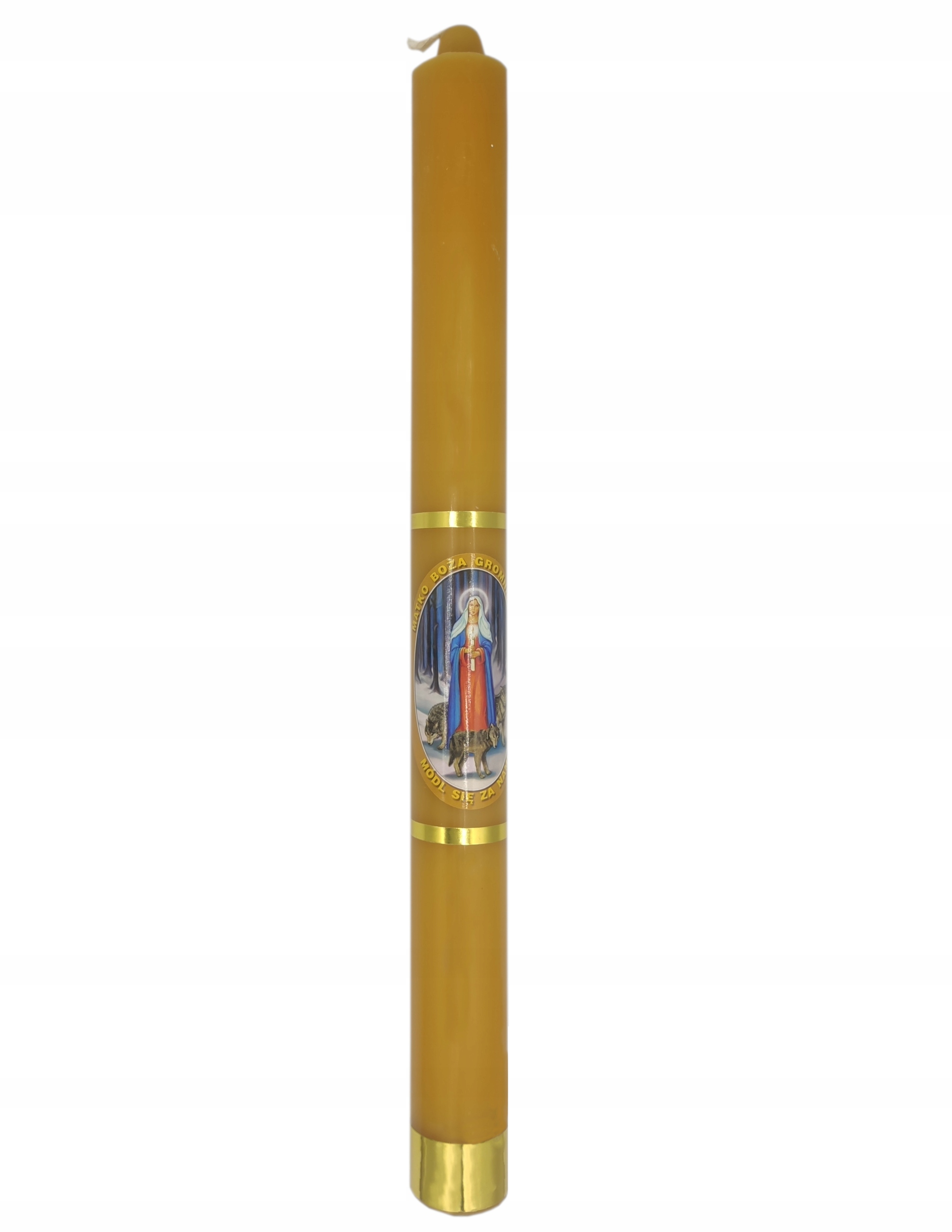 Gromnica z emblematem Matki Bożej Gromnicznej wykonana z wosku. Wysokość 35 cm, średnica 3 cm.