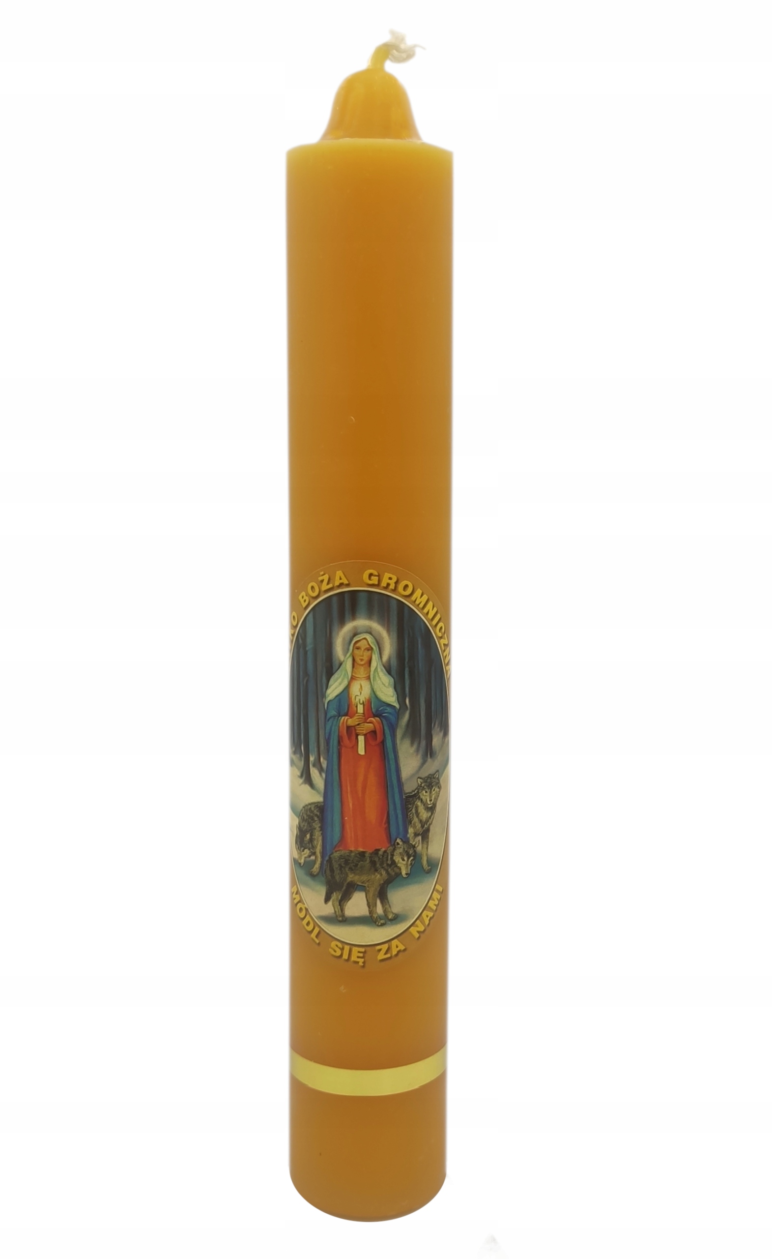 Gromnica z emblematem Matki Bożej Gromnicznej wykonana z wosku. Wysokość 20 cm, średnica 3 cm.
