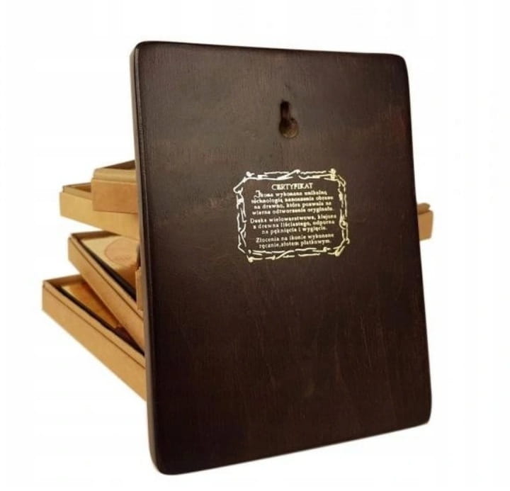 Z tyłu ikony certyfikat. Całość zapakowana w pudełko z papieru ekologicznego.