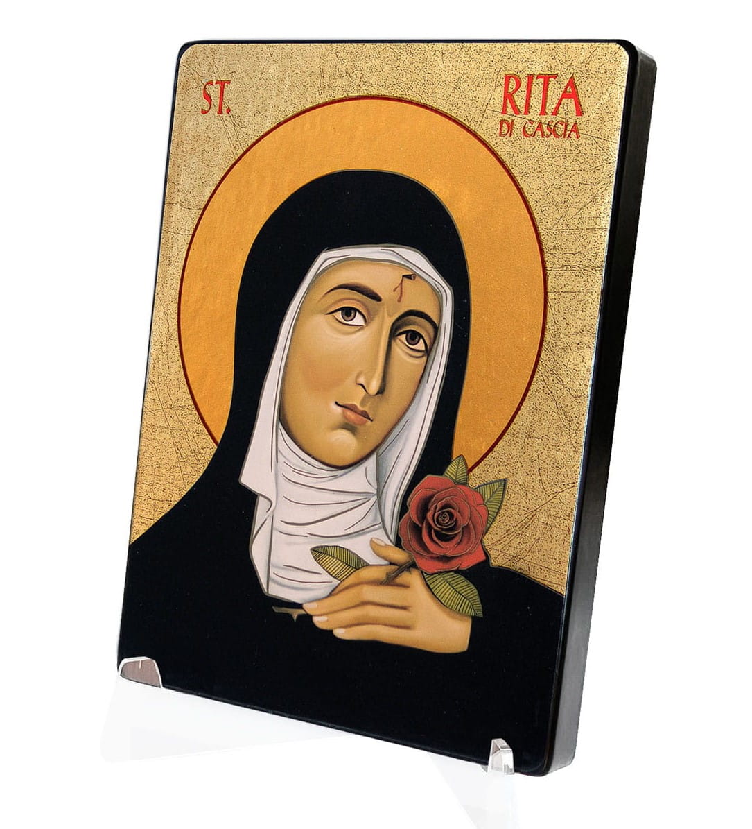 Na prezentowanej ikonie religijnej znajduje się wizerunek Świętej Rity. Święta pochodziła z prostej rodziny. W młodym wieku została wydana za mąż za Paula Manciniego, który był awanturniczy i porywczy. Narodziny dwóch synów wniosły chwile spokoju do ich małżeństwa, ale zanim osiągnęli oni pełnoletność, mąż Rity wdał się w kolejne spory klanowe i polityczne. Zginął w zastawionej na niego zasadzce. Śmierć ojca chcieli pomścić jego dorastający synowie, jednak nie zdążyli, bo zmarli na dżumę. Rita postanowiła wstąpić do klasztoru augustianek eremitek w Cascii. Nie została jednak przyjęta. Gdy po raz drugi poprosiła o przyjęcie do tego klasztoru, postawiono jej warunek, że musi pogodzić zwaśnione rodziny w okolicy Cascii. W czasie życia zakonnego otrzymała jeden stygmat – otwartą ranę na czole po cierniu z korony. Św. Rita jest patronką matek, które heroicznie budują jedność w rodzinie. Do niej zwracają się osoby z prośbą w sprawach beznadziejnych.