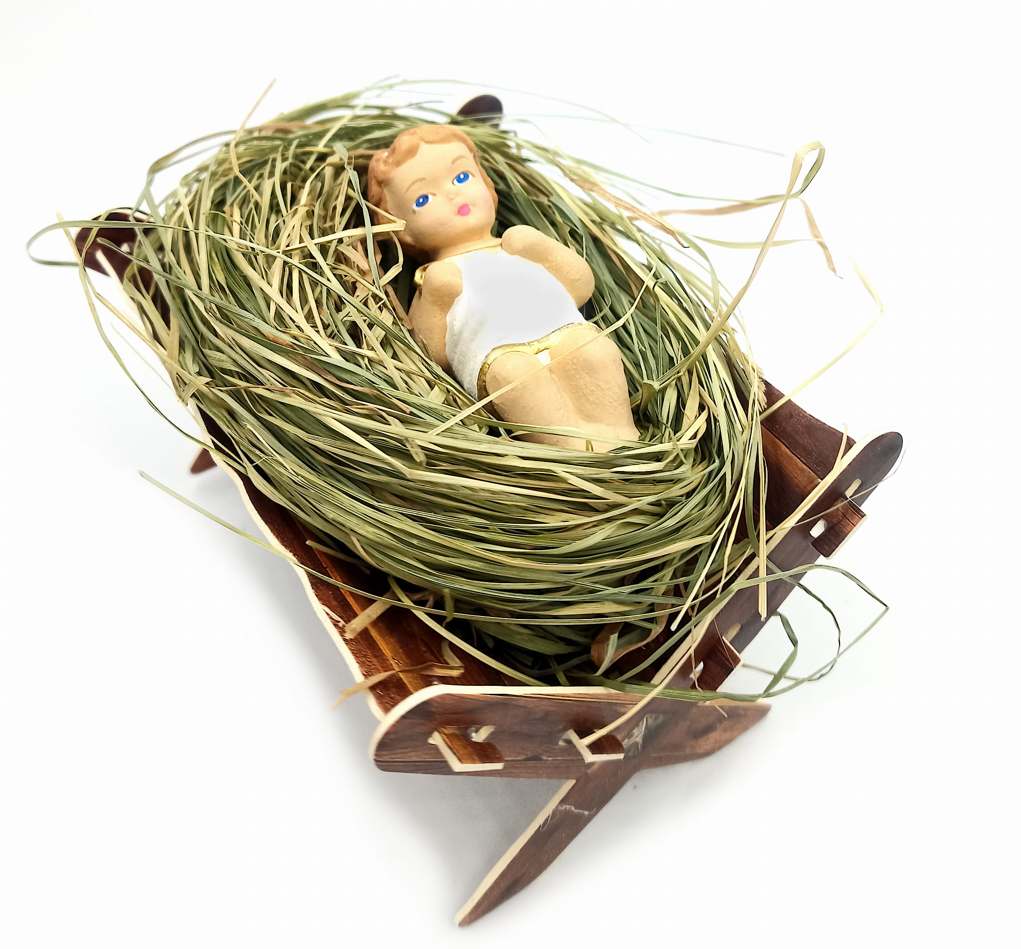 Figurka Dzieciątka Jezus na sianku. Zestaw zawiera trzy elementy; figurkę, sianko oraz żłobek. Idealny do ręcznie robionych szopek ale również jako element wystroju świątecznego domu. Dzieciątko wykonane jest z gipsu, ręcznie malowane, sianko naturalne, żłobek z materiału drewnianego.