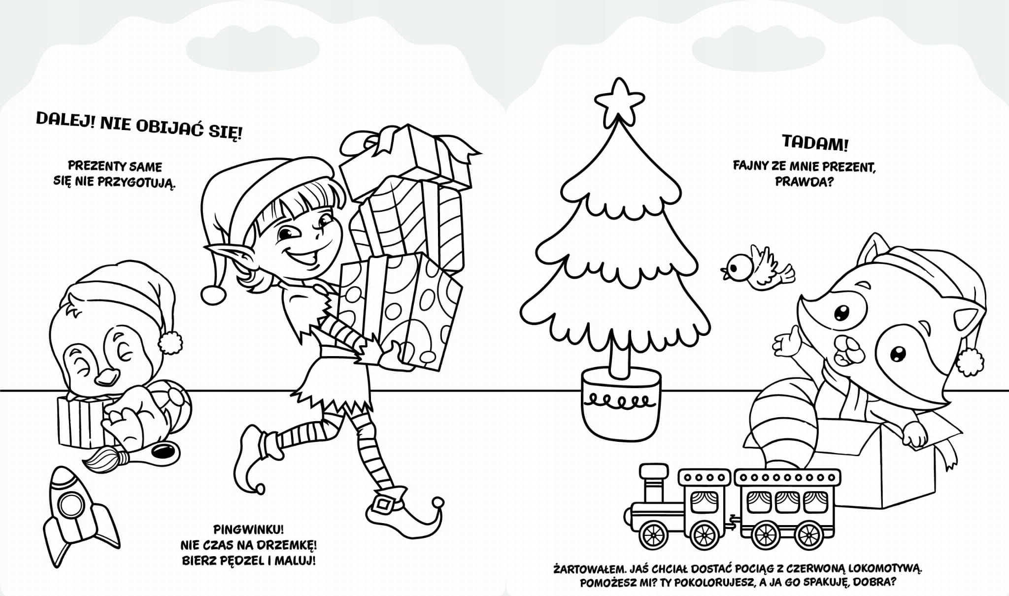 Które dziecko nie jest zainteresowane tym, co dzieje się w okresie przedświątecznym w wiosce Świętego Mikołaja? Kolorowanka w kształcie teczuszki uchyla rąbka tajemnicy. Pozwala podglądać Mikołaja oraz jego pomocników podczas przygotowywań do najważniejszego dnia w roku, czyli dnia rozdawania prezentów grzecznym dzieciom! Książeczka zawiera naklejki.