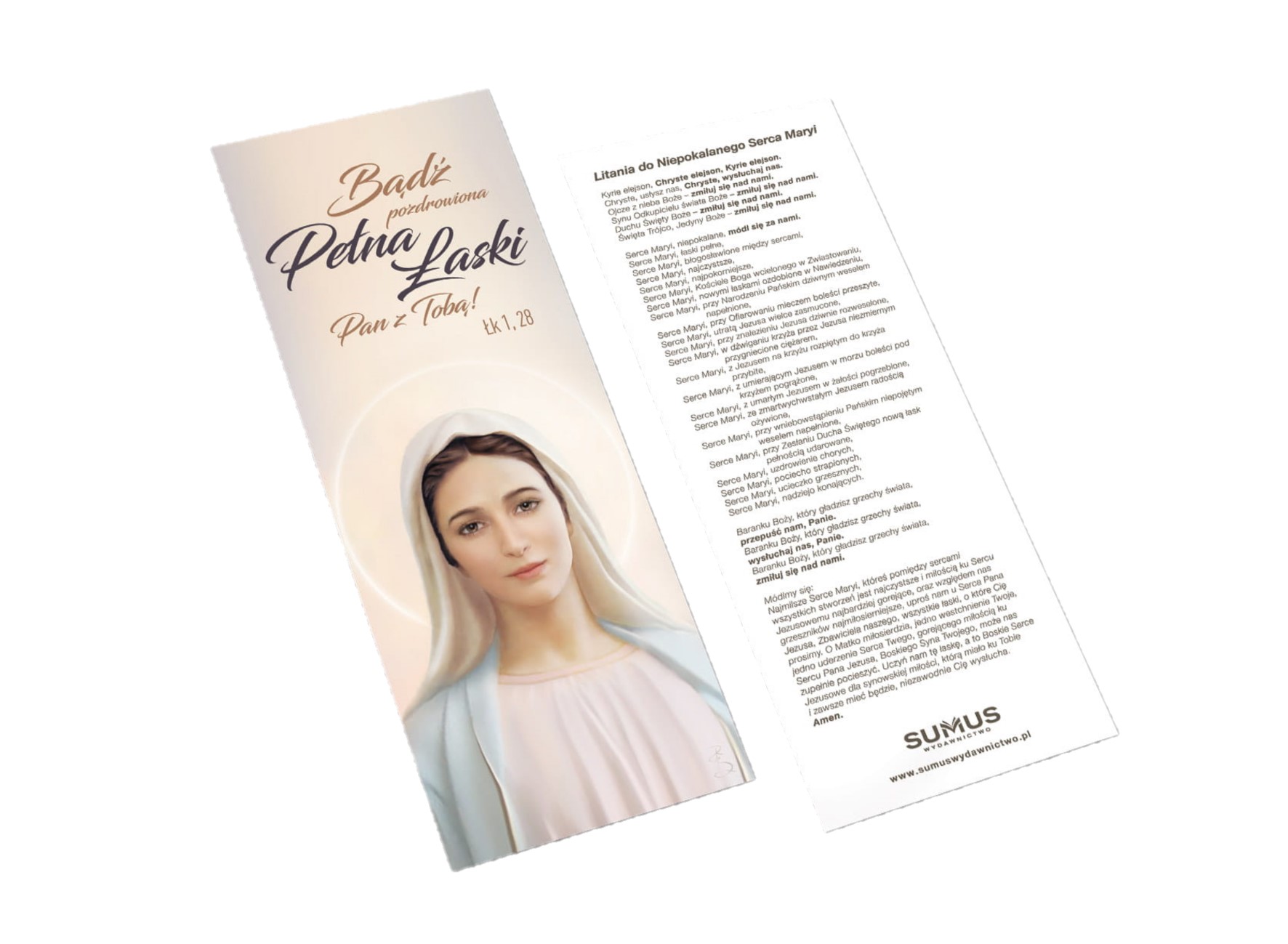 Zakładka o wymiarach 7 x 18 cm. Pokryta folią soft touch i lakierem UV. Z tyłu znajduje się litania do Niepokalanego Serca Maryi.