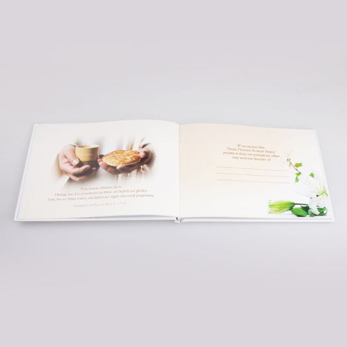 W uroczystym dniu Pierwszej Komunii Świętej pragniemy obdarować nasze dzieci wyjątkowymi prezentami. Jednym z nich może być ten pamiątkowy album, w którym jest miejsce na dedykację i płynące z głębi serca życzenia. Album pozwoli dziecku zapamiętać ten radosny dzień spotkania z Jezusem. Wydany został w dwóch wersjach: z okładką dla dziewczynek i dla chłopców.