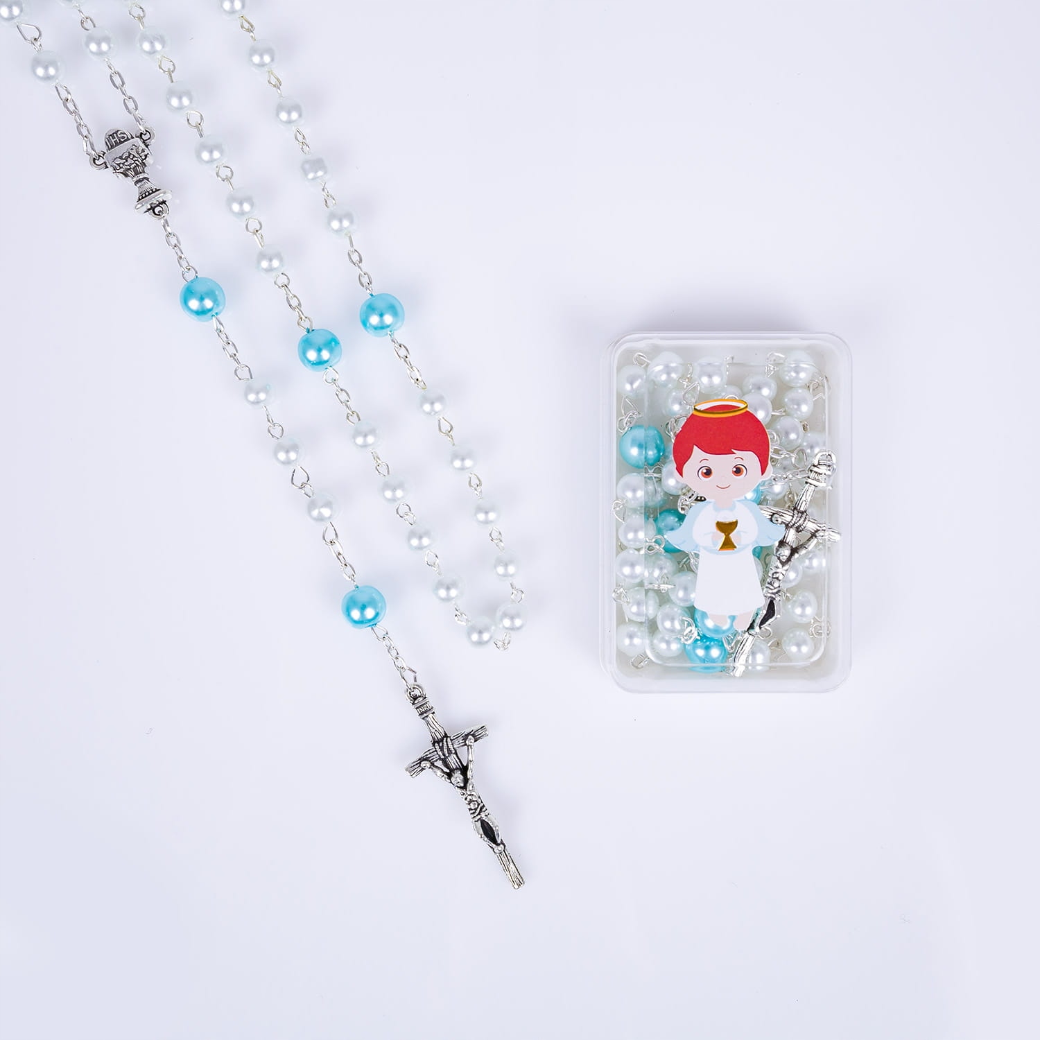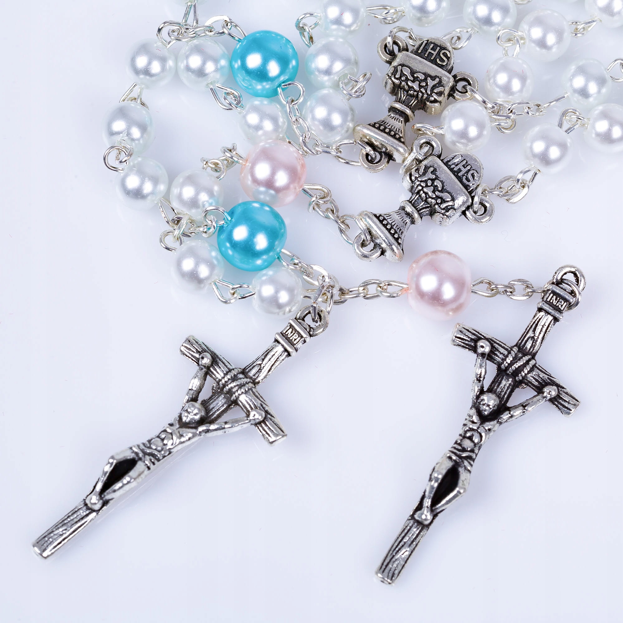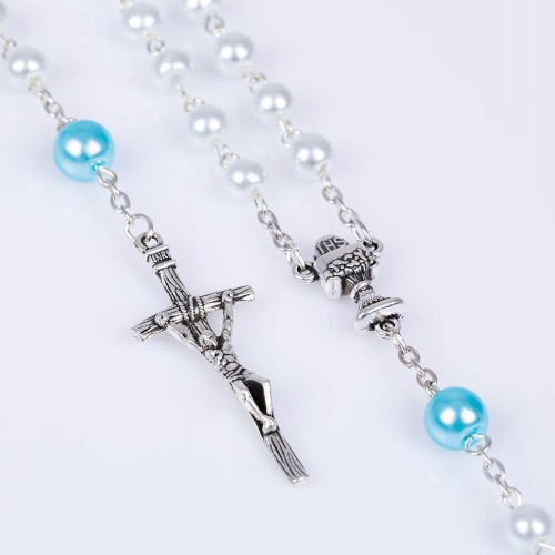 Koraliki o średnicy 6mm i 8mm z łącznikiem przedstawiającym hostię z napisem IHS. Różaniec będzie nie tylko pięknym podarunkiem na uroczystość Pierwszej Komunii Świętej, ale też narzędziem dla pięknej, dziecięcej modlitwy.