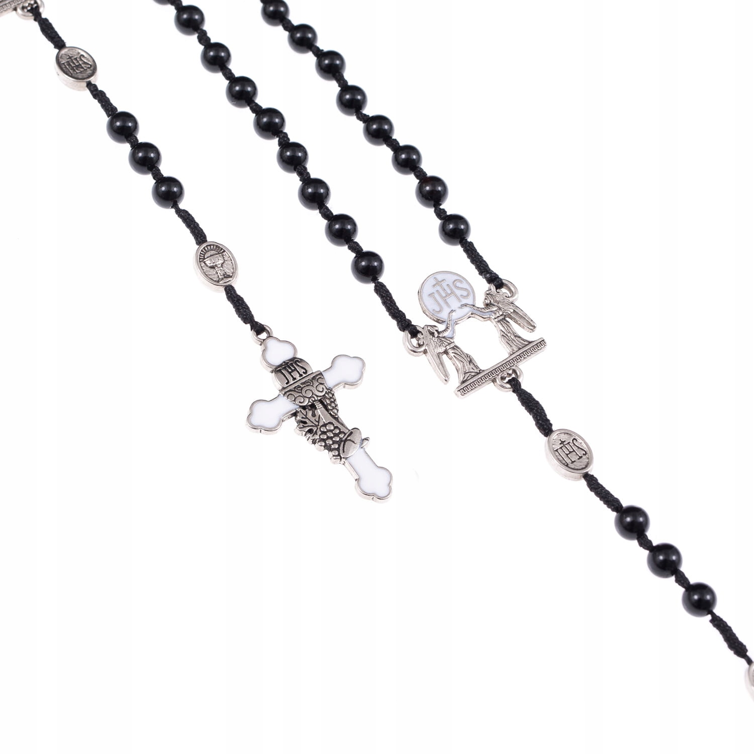 Paciorki wykonane z agatu z wyjątkowym łącznikiem przedstawiającym dwa anioły trzymające hostię z napisem IHS. Różaniec będzie nie tylko pięknym podarunkiem na uroczystość Pierwszej Komunii Świętej, ale też narzędziem dla pięknej, dziecięcej modlitwy.