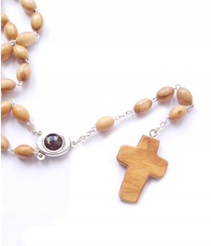 Różaniec wykonany z drzewa oliwnego z medalikiem zawierającym Ziemię Świętą. Krzyż przedstawiający Jezusa Dobrego Pasterza wykonany również z drzewa oliwnego
