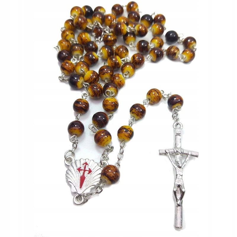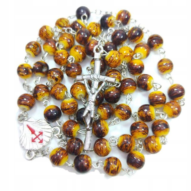 Piękny różaniec ze szklanych paciorków ze srebrnym krzyżem oraz łącznikiem z symbolem Muszli św. Jakuba.
