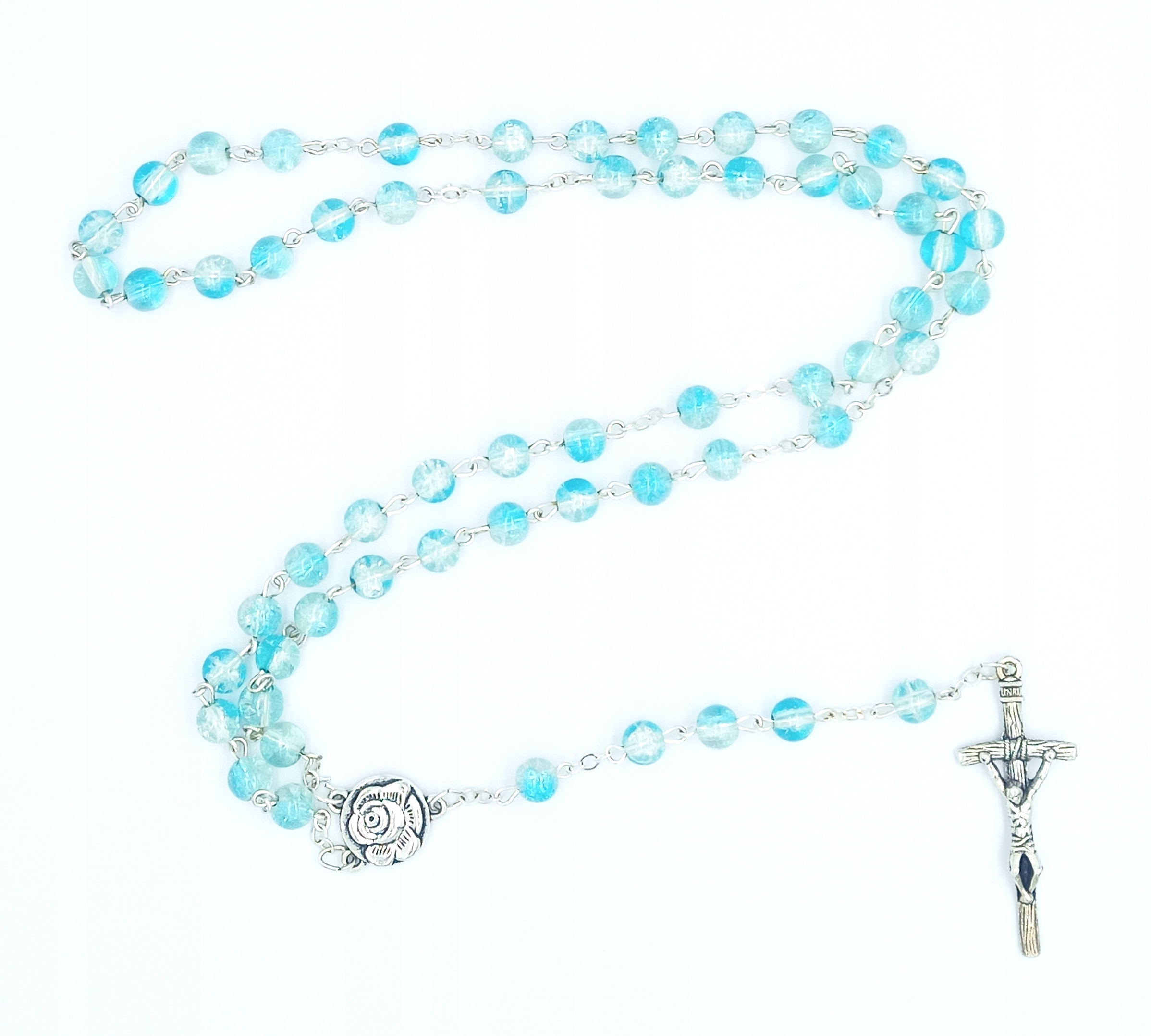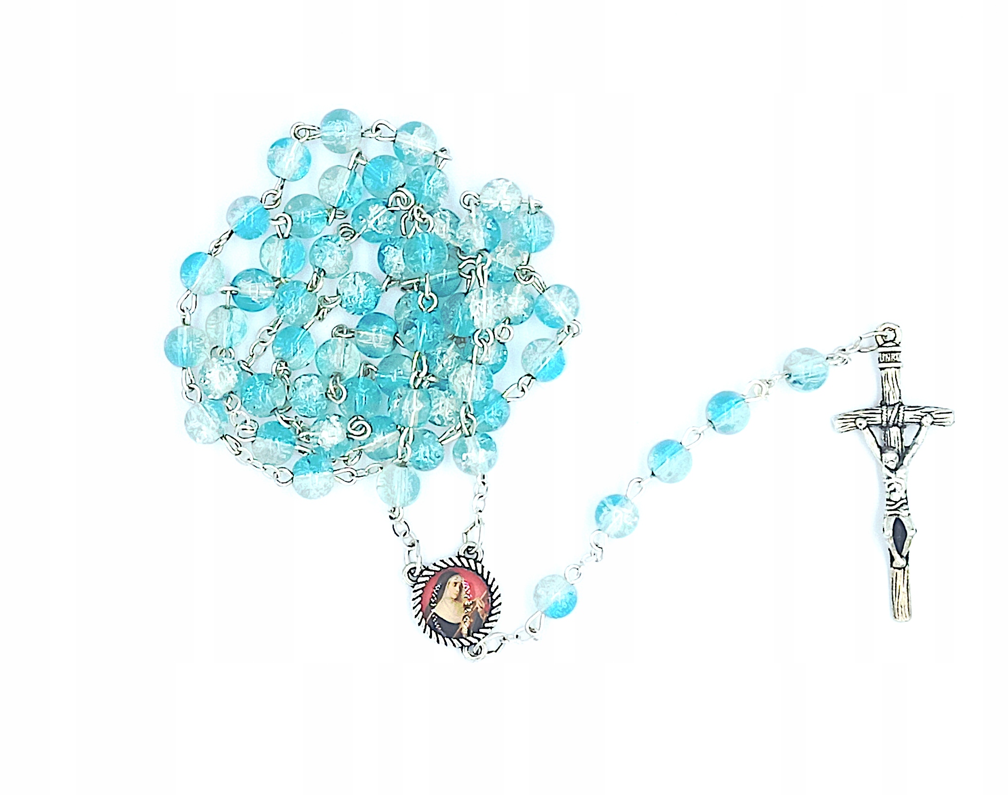 Ręcznie robiony różaniec - naszyjnik z medalikiem św. Rity zakończony krzyżem.