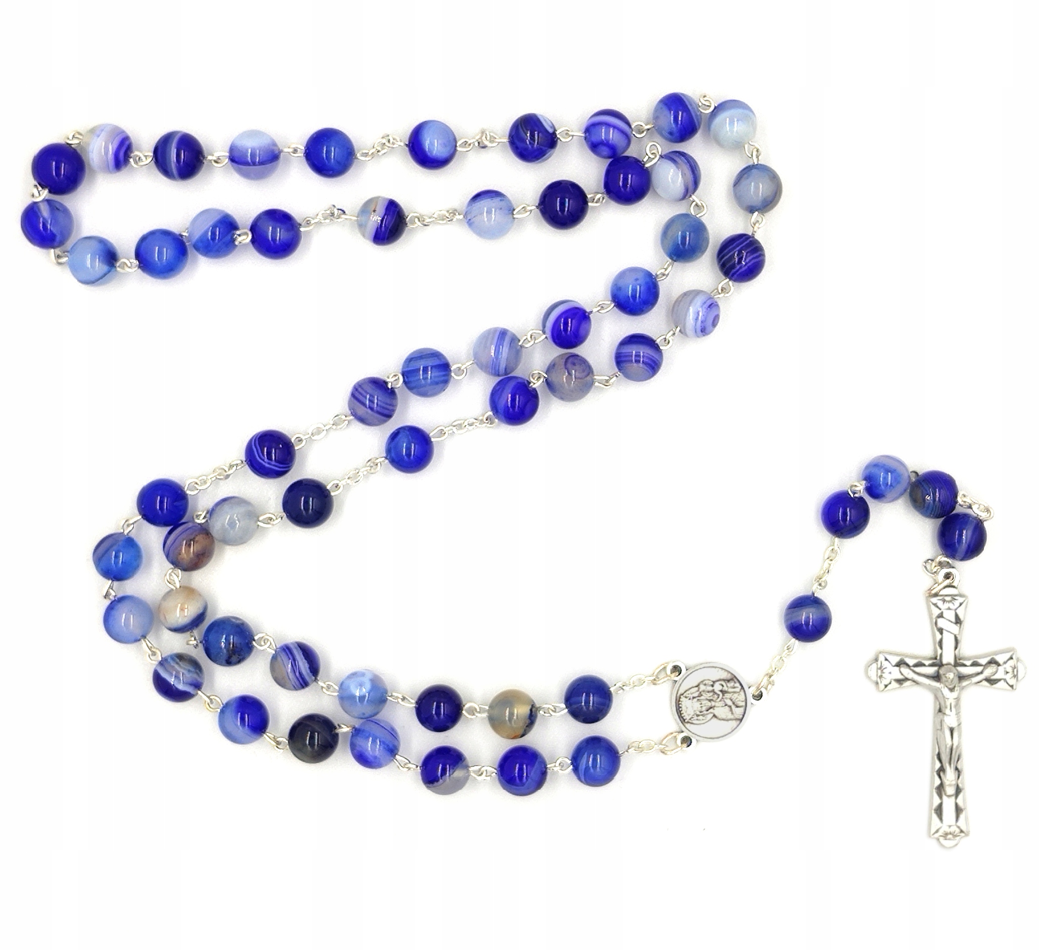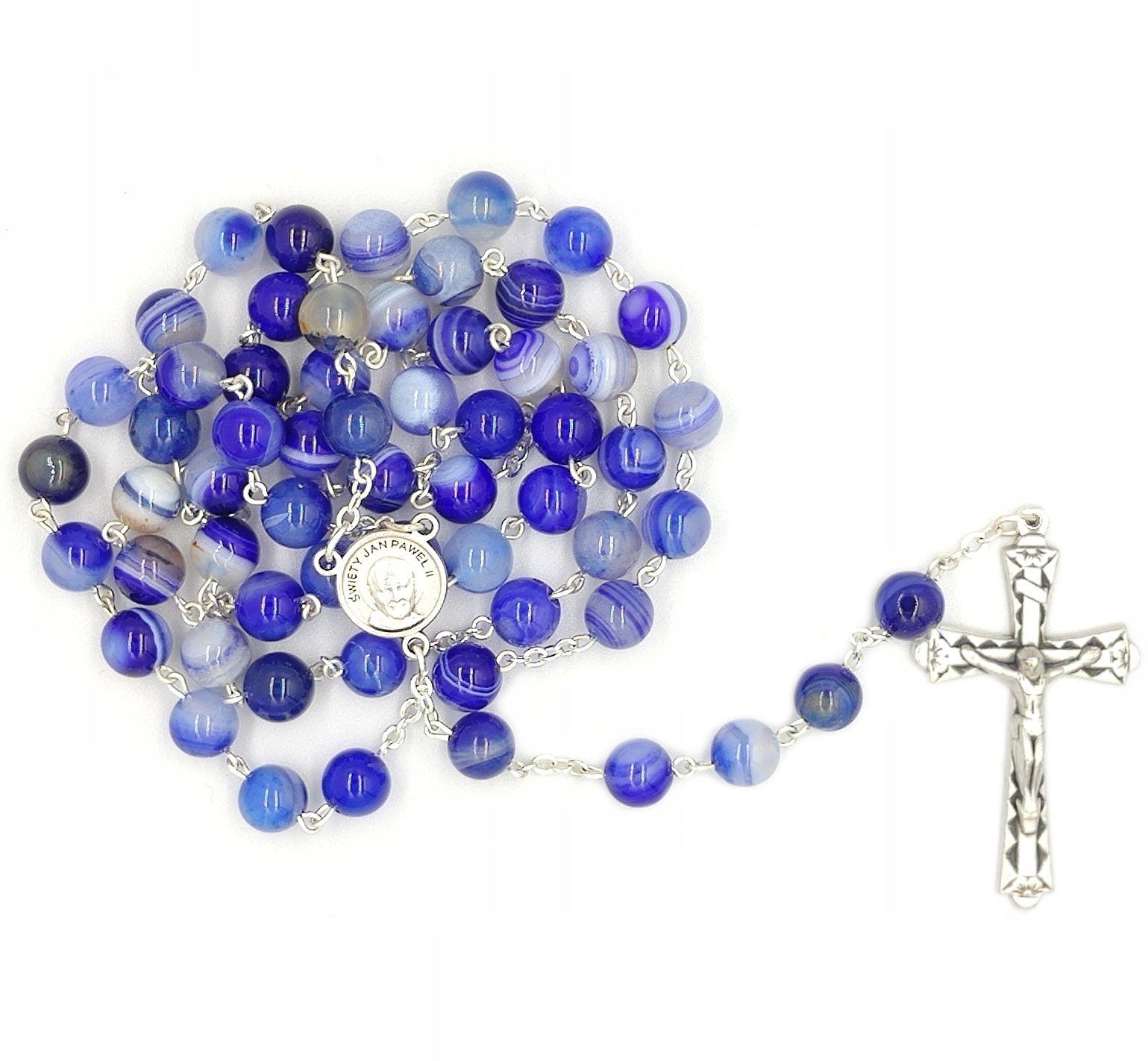Różaniec wykonany z pięknego kamienia w kolorze granatowym. Na łączniku widnieje wizerunek Św. Jana Pawła II oraz Matki Boskiej.