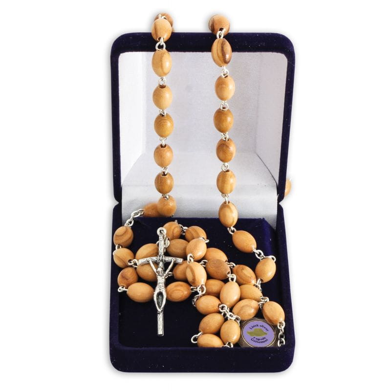 Drzewa oliwne są biblijnymi symbolami Bożego błogosławieństwa. Oznaczają też przebaczenie, pokój i płodność a także, ze względu na oliwę, którą wytwarza się z ich owoców, wiążą się z symboliką światła. Są drzewami biblijnymi (pojawiają się w Piśmie św. aż 50 razy). Trudno o bardziej stosowne zatem drewno do wyrobu różańców. W Ogrodzie Oliwnym w Jerozolimie Chrystus w przededniu swojej Męki doświadczał trwogi konania. Wielu sądzi, że bardzo stare drzewa oliwne, które tam do dziś się znajdują były świadkami tych wydarzeń. Drobinki liści z tych drzew zatopiono w łączniku tego wyjątkowego różańca.