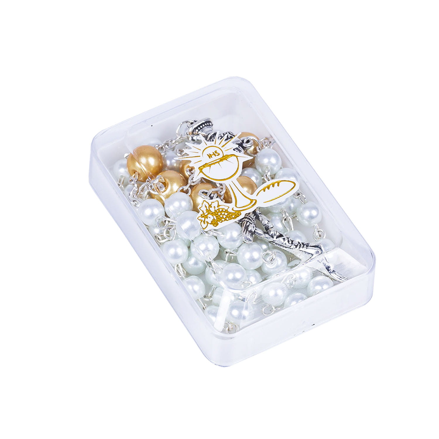 Różaniec prezent pierwszokomunijny. Paciorki z perełkowych koralików z krzyżem św. Jana Pawła II. Będzie nie tylko pięknym podarunkiem na uroczystość Pierwszej Komunii Świętej, ale też narzędziem dla pięknej, dziecięcej modlitwy.