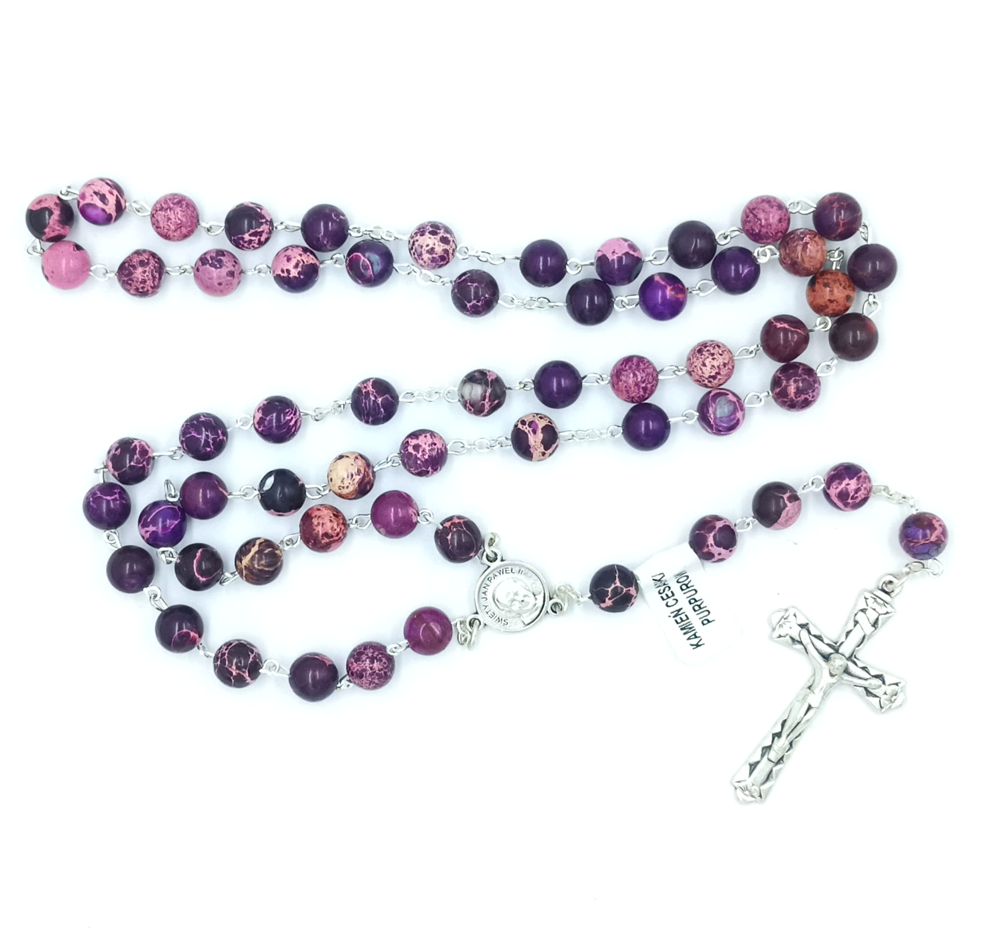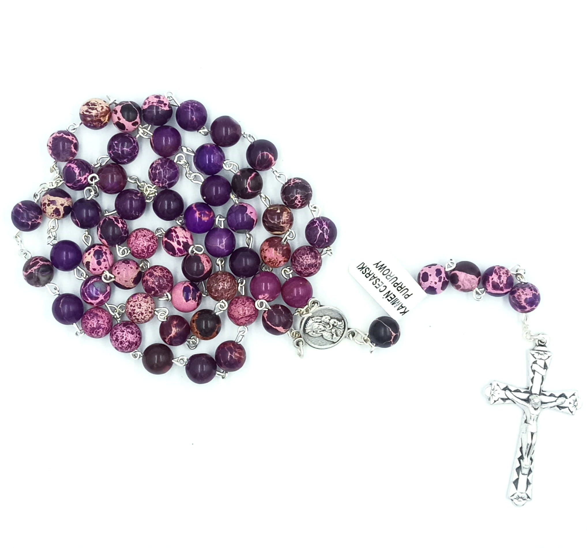 Różaniec wykonany z pięknego kamienia cesarskiego w odcieniach fioletu.