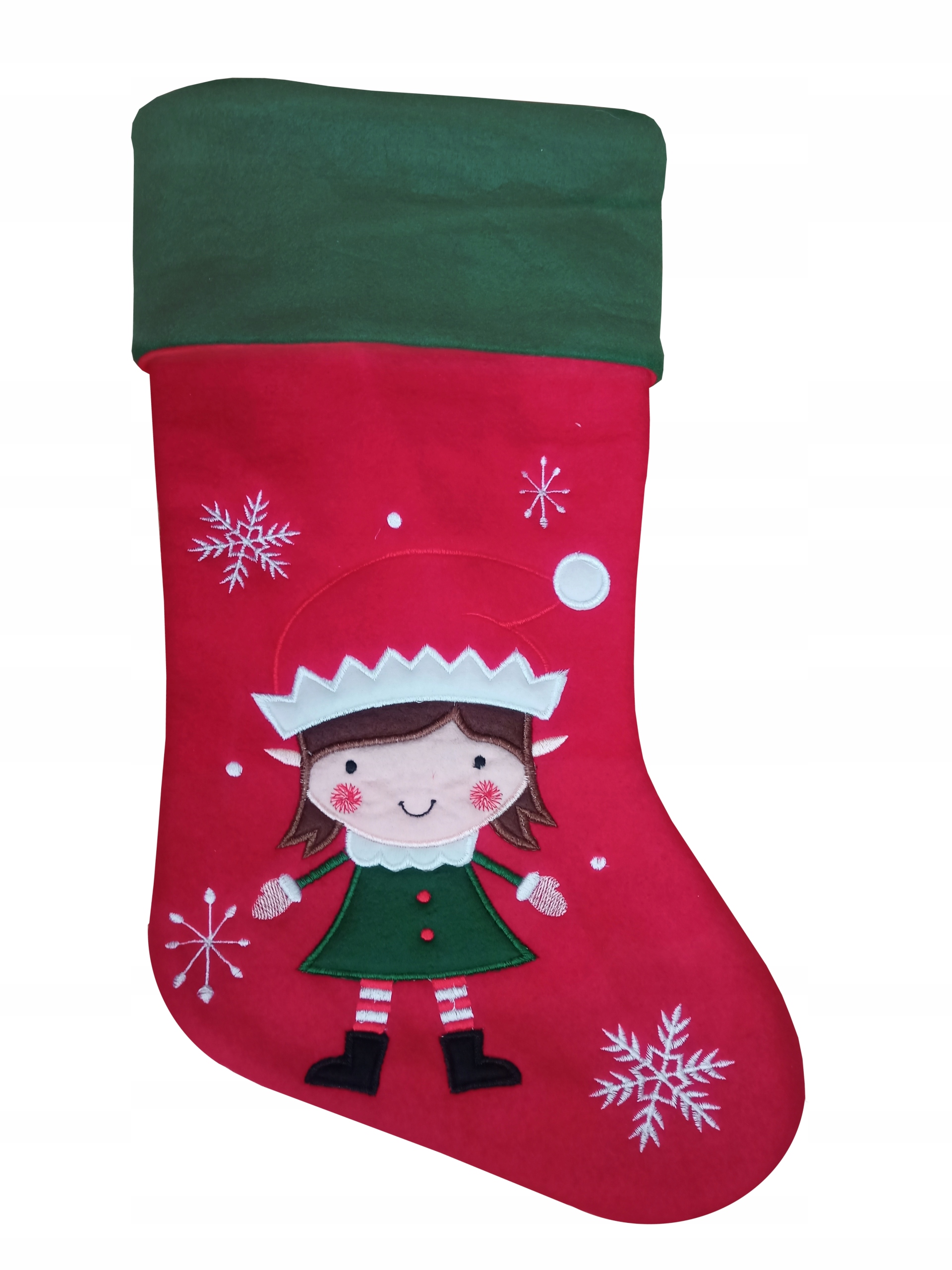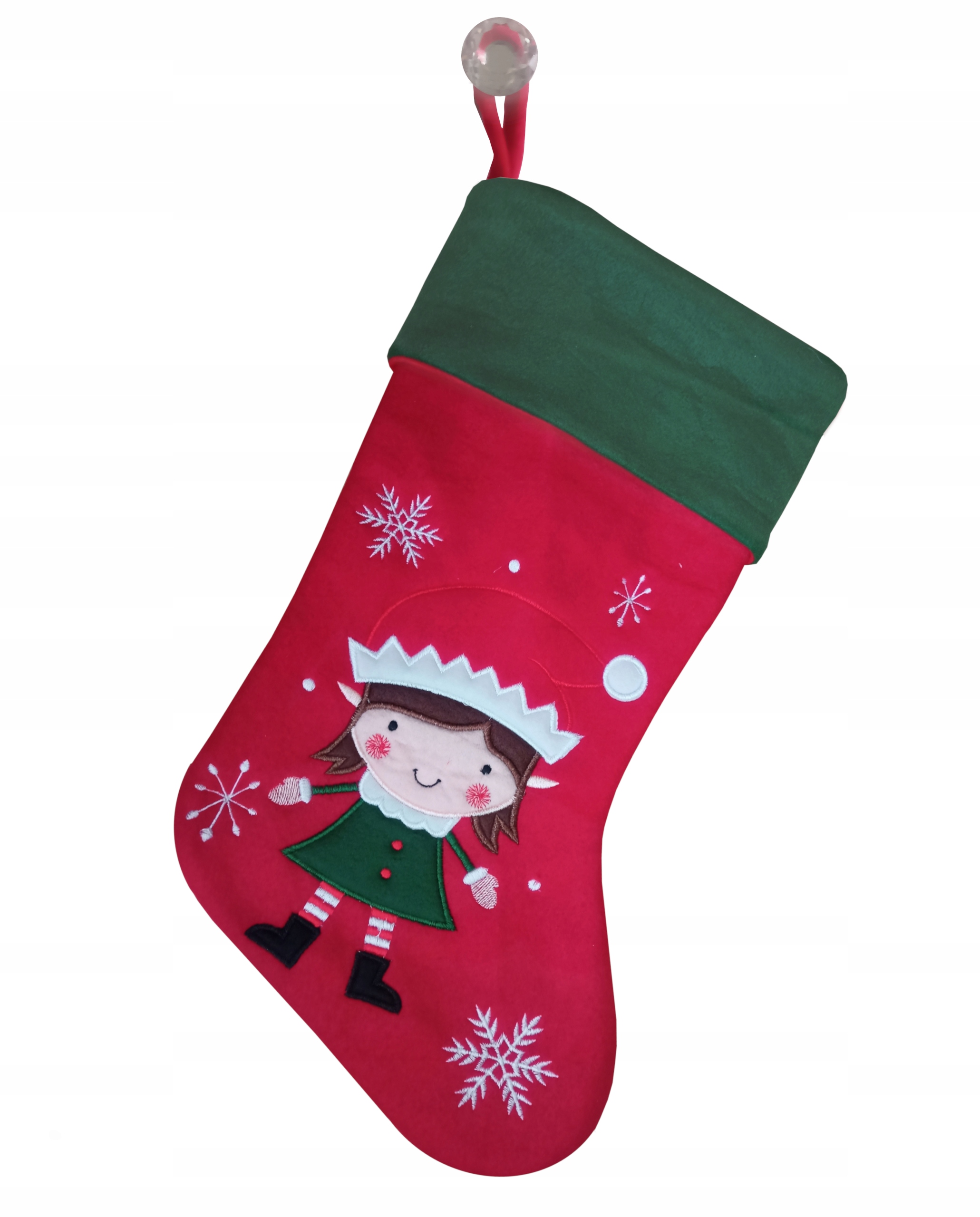 Skarpeta bożonarodzeniowa z zawieszką - idealna na prezenty, upominki, słodycze. Może również służyć jako nietuzinkowa dekoracja świąteczna. Skarpetka wykonana z filcu, zdobiona świątecznym elfem i białymi śnieżkami.