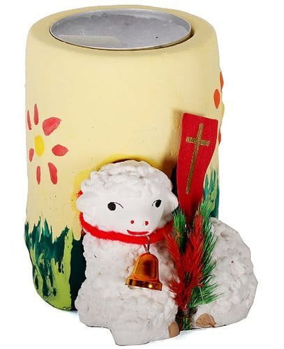 Śliczny świecznik z Wielkanocnym Barankiem wykonany z gipsu. Świecznik na świeczki typu tealight.