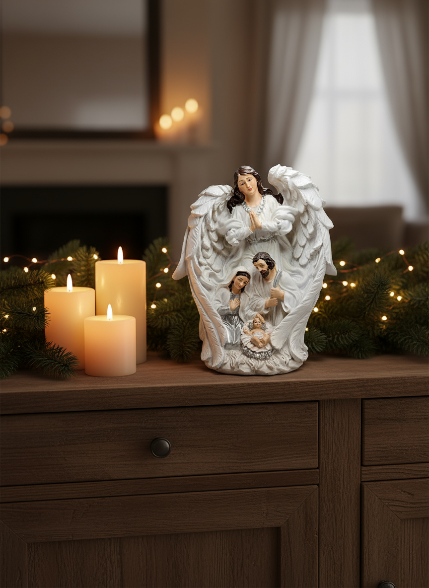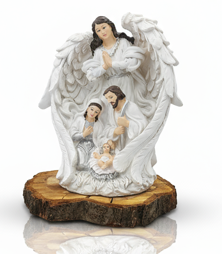 Elegancka szopka bożonarodzeniowa w biało‑srebrnej stylistyce przedstawia Świętą Rodzinę otuloną skrzydłami anioła, wprowadzając do wnętrza spokój, opiekę i świąteczny blask. Wykonana z trwałej żywicy i starannie ręcznie malowana, zachwyca minimalistyczną formą i dopracowanymi detalami.