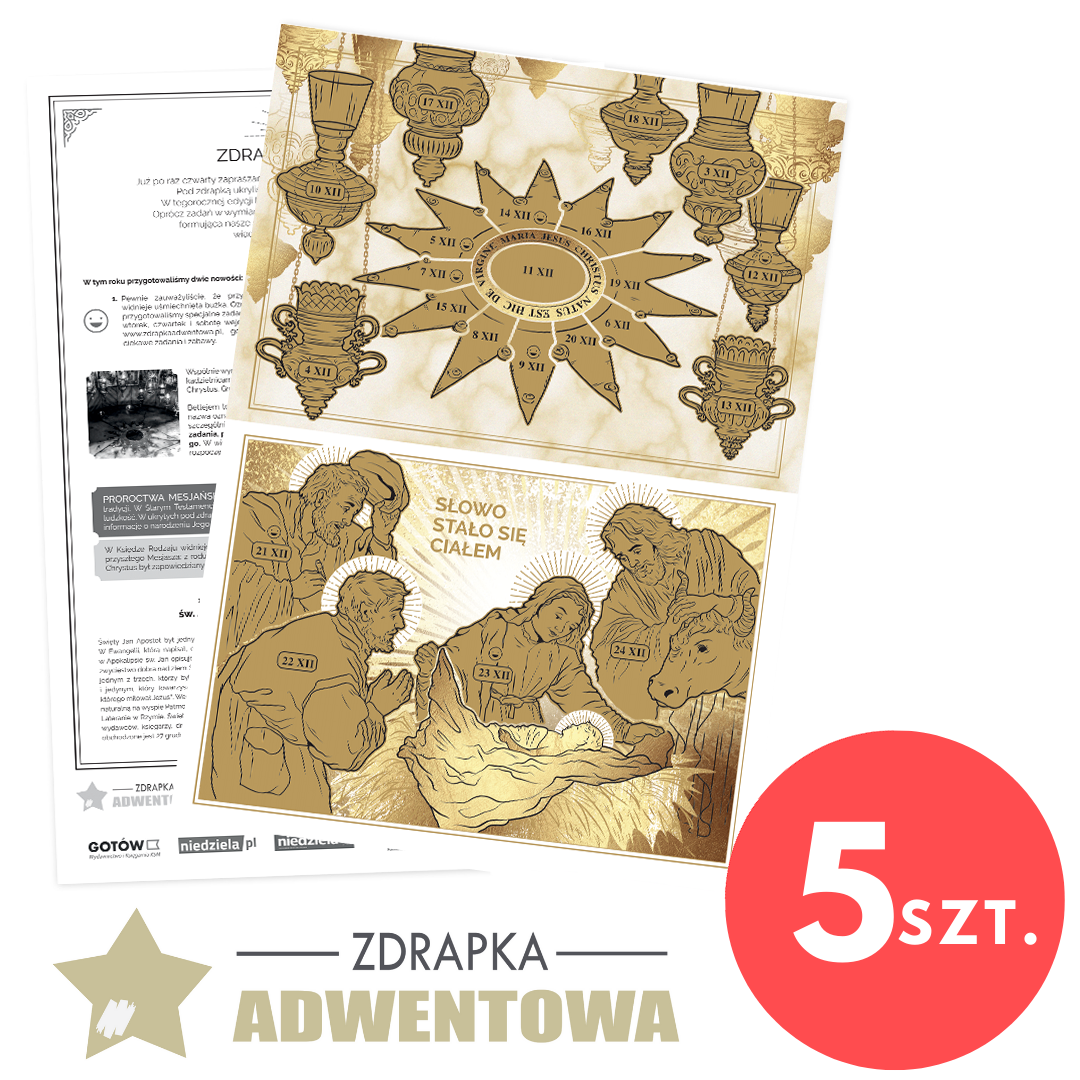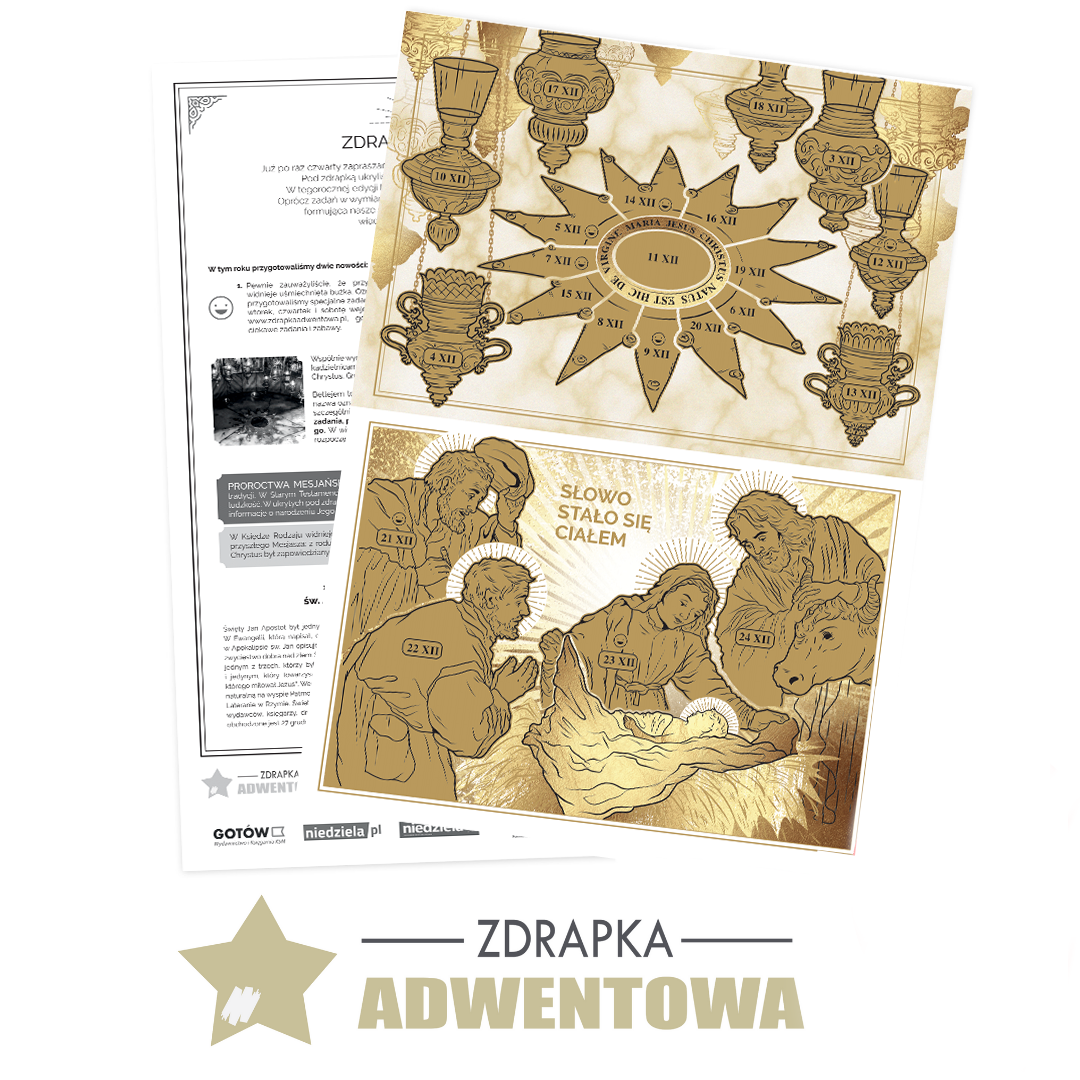 Zdrapka Adwentowa to plansza zawierająca 28 specjalnych zadań do wykonania w czasie adwentu. Zadania pomagają przygotować serce i dom na Boże Narodzenie. Podejmij wyzwanie i zadbaj o duchowy wymiar świąt. Przeżyj niezwykłe, indywidualne rekolekcje adwentowe. Zadania motywują do rachunku sumienia, modlitwy, spowiedzi, ponadto zachęcają do otworzenia się na pojednanie w rodzinie oraz troskę o parafię czy sąsiedztwo.